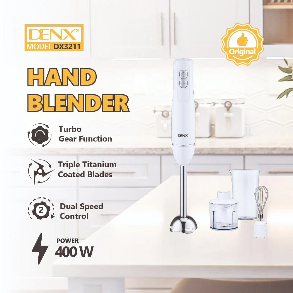 استمتع بتحضير أشهى الوصفات بسهولة مع خلاط دينيكس DX3211 (4×1)، بقوة 400 واط وملحقات متعددة لخلط وفرم وخفق المكونات بدقة وسرعة فائقة.